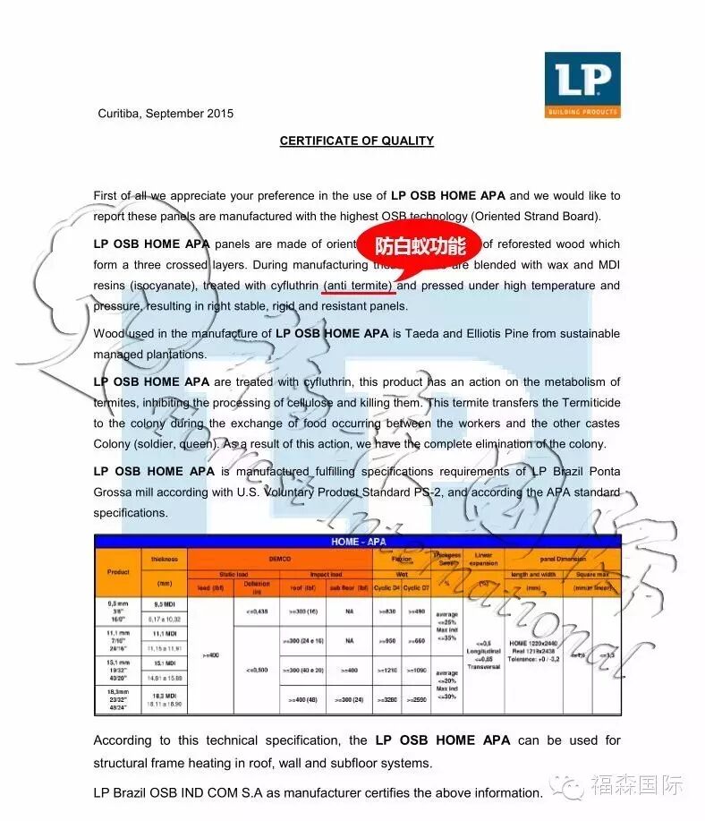 進(jìn)口LP-OSB(定向刨花板)除了抗彎強(qiáng)度高,抗潮性能強(qiáng),線膨脹系數(shù)小,尺寸穩(wěn)定,材質(zhì)均勻,握釘力,抗沖擊力強(qiáng),易加工等優(yōu)點外還具有防白蟻功能。